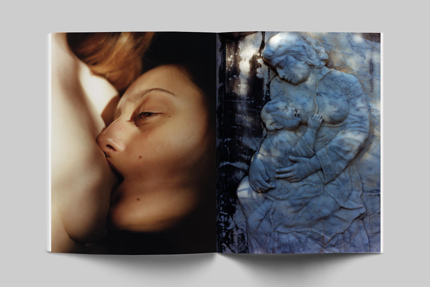 The book contains a body of new work and never before published fashion and documentary photographs. Childhood friends, colleagues and models are collaborators to Weir, and their input has been vital when constructing her work and interpreting the theme. The models Jess Maybury and Lily Newmark , who have starred in previous works, are here captured as Mary and Child. Likewise, the stylist Camille Bidault-Waddington appears in a diptych beside her son Albert Cocker, also evoking Christian iconography. Harley’s childhood friend appears in a series of self-portraits depicting his experimentation with womanhood through crossdressing, published alongside private emails to his lover. Inspired by the multi-media artist Colette Maison Lumiere and her exploration of gender roles imbued in interiors, self portraiture and performance, Weir has created a series in collaboration with set designer Emma Roach, overpainting each of the images. A number of suggestive still-lifes appear throughout the book exploring the function of sexiness and the body as a commodity. The ending is a series of photographs documenting the labour of birth giving the viewer an encounter with the place with which we all came from.