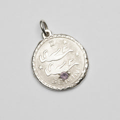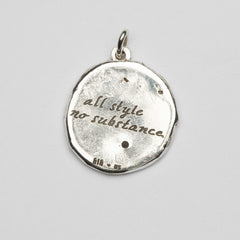 20mm Sterling Silver 'Gemini' pendant set with a 2.5mm synthetic Alexandrite In collaboration with poet Hera Lindsay Bird the back of the pendant is engraved 'all style no substance' Varying chain lengths available Made in Melbourne, Australia
