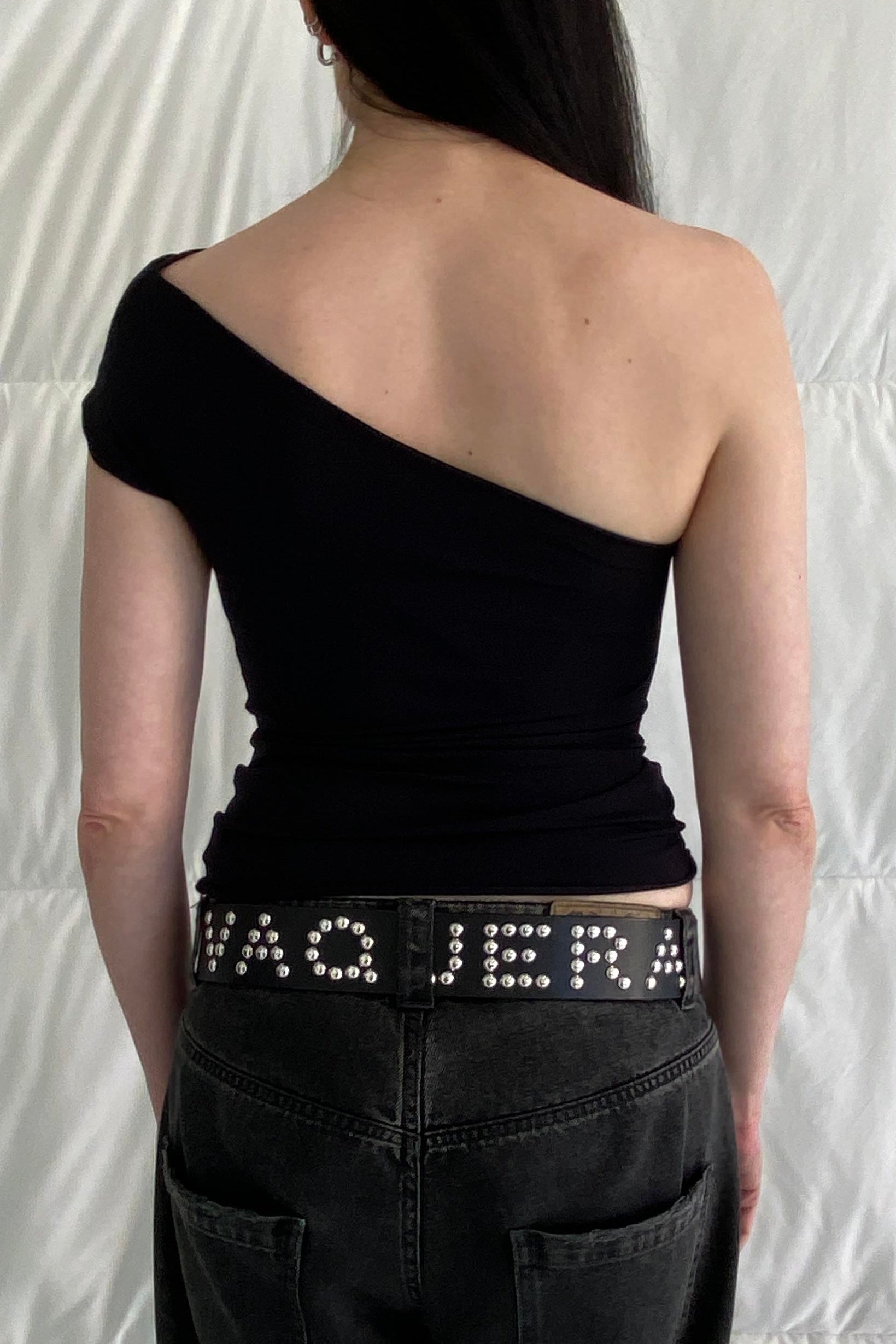 • Soft knit jersey one shoulder top available in Black and French Navy