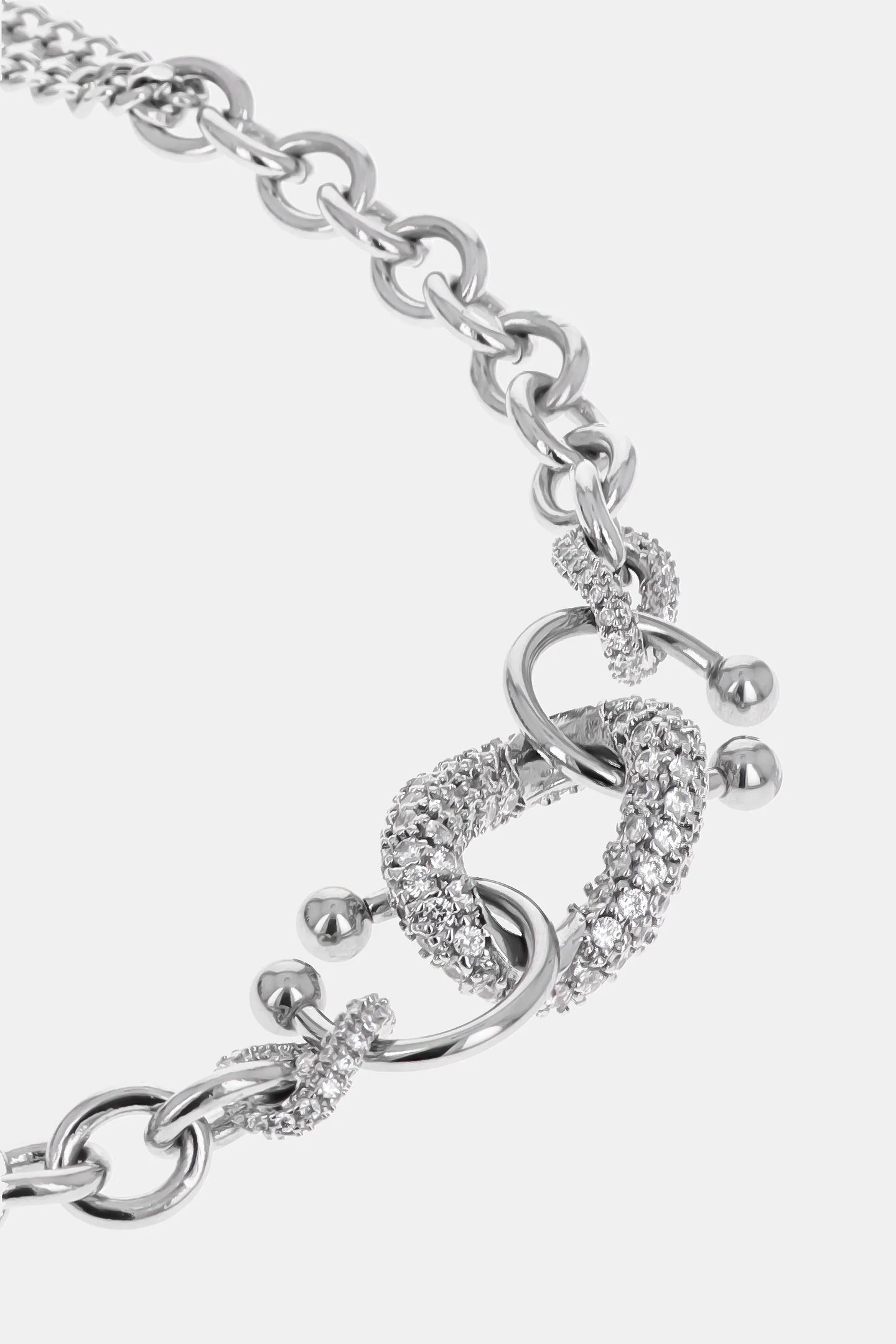 • One side features various-sized thick circle piercings embellished with crystal rhinestones. The other half showcases a double chain